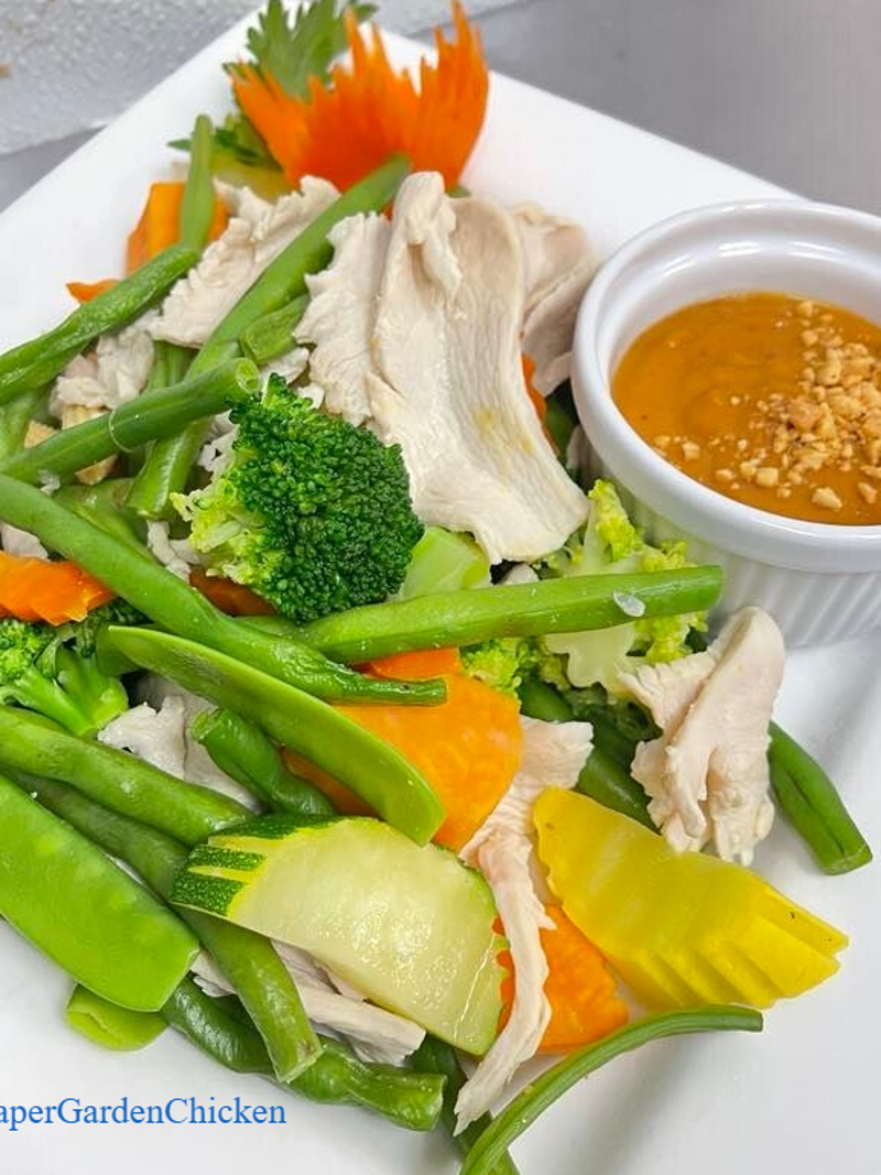 Rice Paper Garden Chicken lunch $12.95 dinner $17.95 Boiled chicken, broccoli, green bean, carrot, snow pea, baby corn, zucchini, summer squash, and sweet potatoes. Served with peanut sauce on the side.
