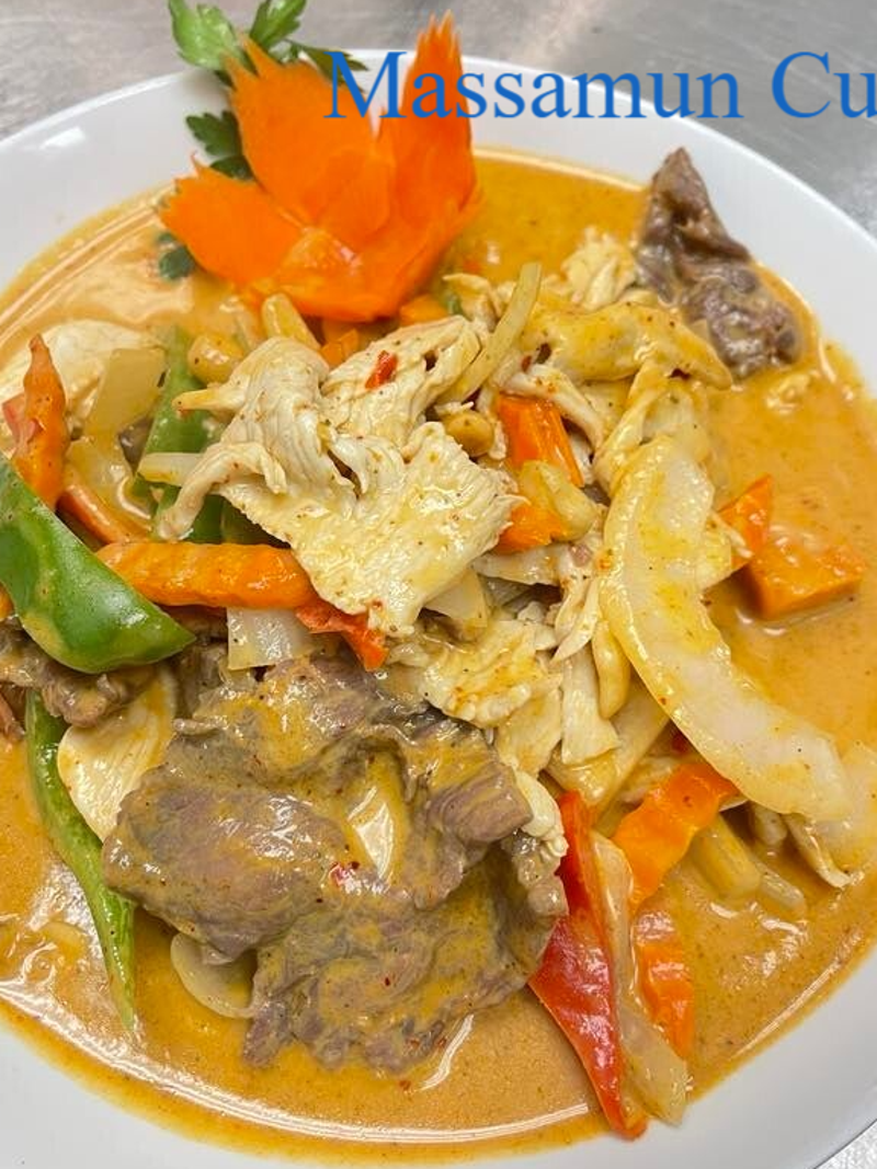 Sautéed sliced chicken with green bean, red and green pepper, snow pea, cashew nuts, and peanuts in a mild curry.
