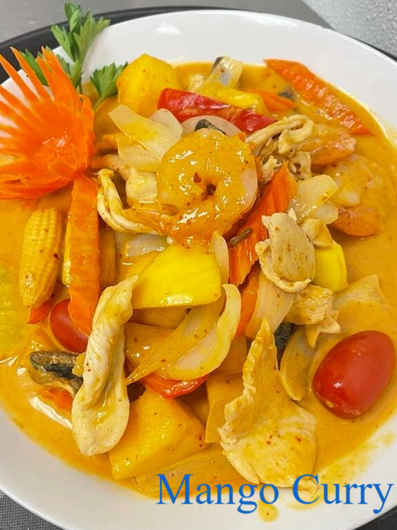 Dices of ripe mango simmered with chicken, shrimp, tomato, red pepper, mushroom, onion, carrot, and summer squash, in a yellow curry.
