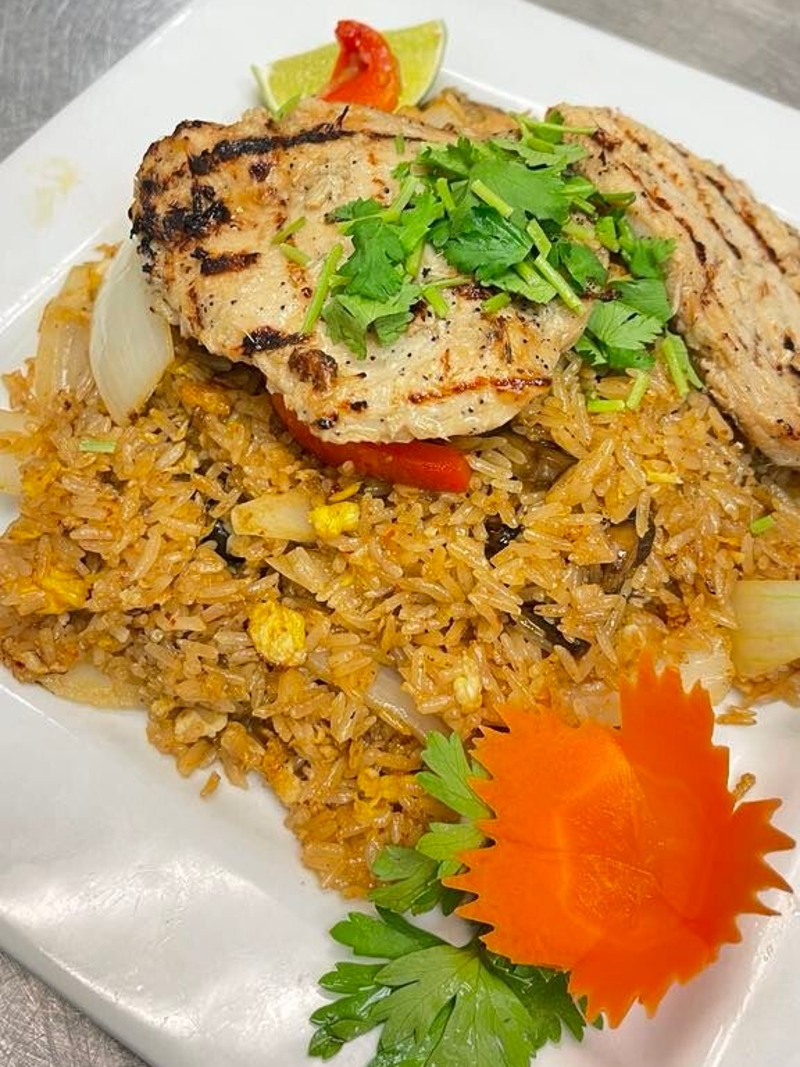 Red curry flavored fried rice with shrimp, onion, red pepper mushroom, and topped with barbecued chicken.