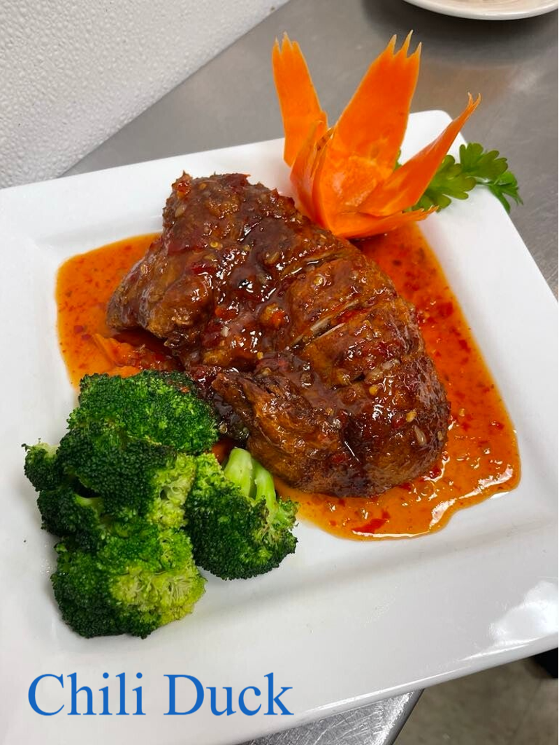 Crispy half boneless roasted duck top with special chili sauce. Served with assorted steamed vegetables.