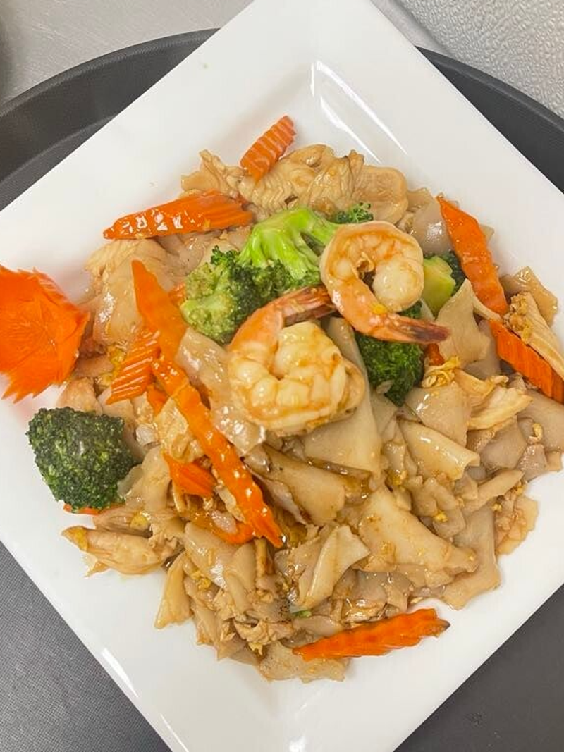 Stir fried wide rice noodles with chicken, shrimp, egg, carrot, and broccoli in House sweet soy sauce.