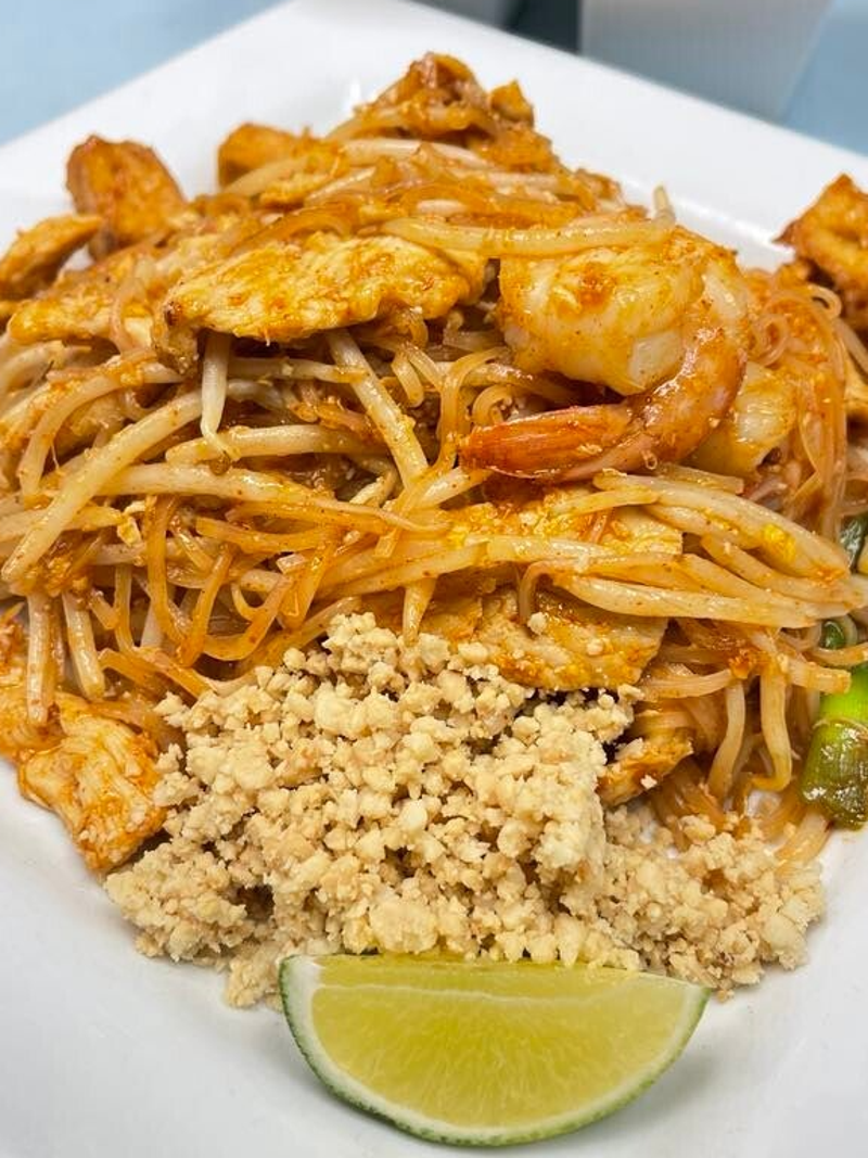 Thin rice noodles stir fried with chicken, shrimp, egg, scallion, bean sprouts, and ground peanuts.