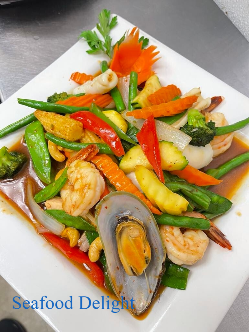 Combination of shrimp, scallop, squid, mussel sautéed with assorted fresh vegetables in a special brown sauce.