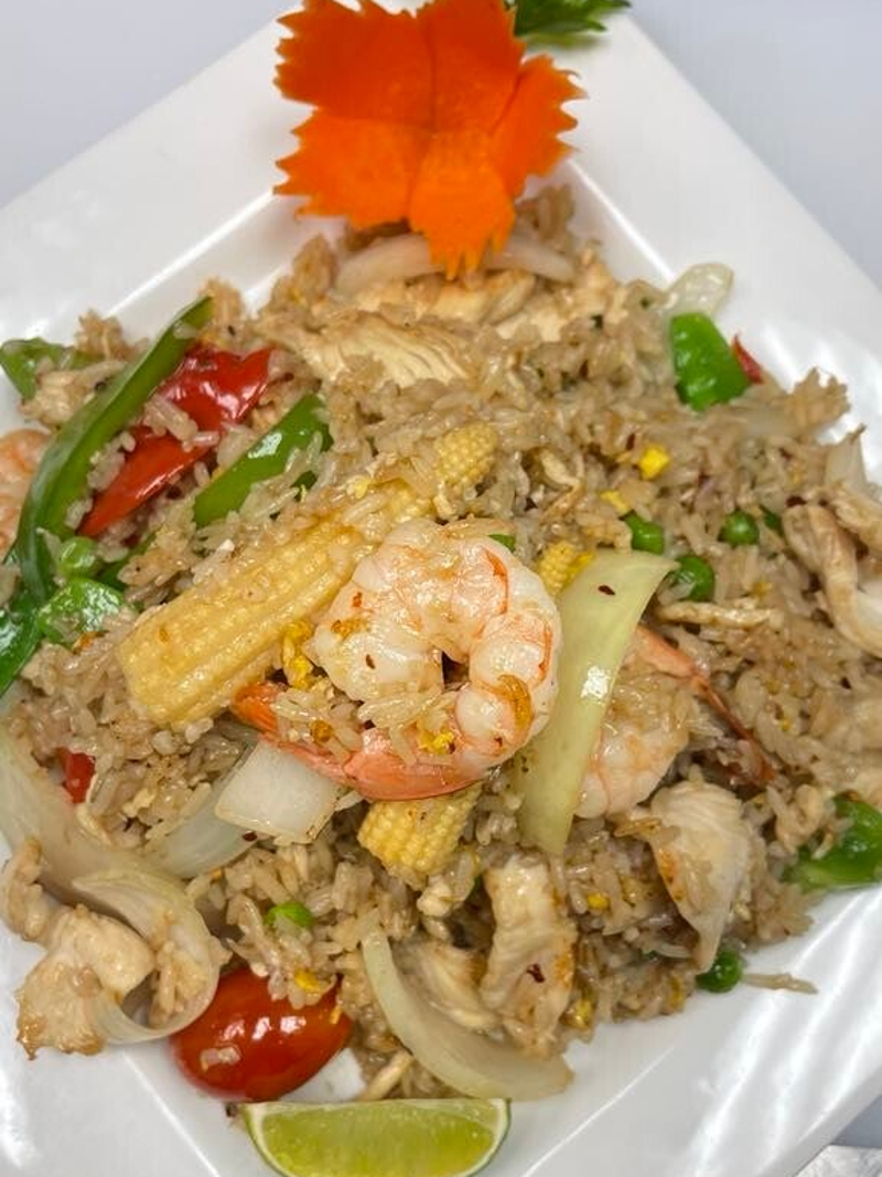 Tom Yum Fried Rice lunch $12.95 dinner $15.95 Fried rice with chicken, shrimp, egg, bell peppers, onion, mushroom, and lemon grass in Tom yum sauce.
